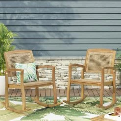 Best Sale 🔥 GDFStudio Uintah Outdoor Acacia Wood And Wicker Rocking Chair (Set Of 2), Light Brown ✨