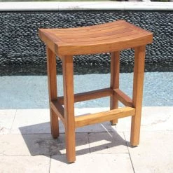 This beautiful OptiAREAโข space saving teak counter stool was designed for convenience and versatility, with a compact yet elegant design. The polished look of the teak bistro stool will add a quality touch to any area you place it. The teak stool is naturally water resistant and suitable for use in any location, either indoors or outdoors. Handcrafted using only sustainably harvested wood, the teak counter height stool features adjustable rubber padded feet for safety and stability. We are so confident that you will love this teak bar stool that we offer a 30 day satisfaction guarantee and 5 year warranty on all of our products! (Some assembly required)