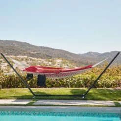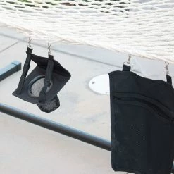 - Double Hammock set includes an easy-care polyester pad and pillow along with a handy drink and Tablet holder