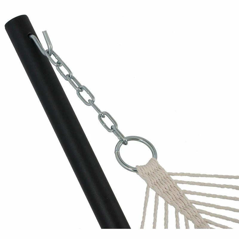 Belleze hammock includes hardwood spreader bars on opposite ends, which attach to a powder-coated steel stand. Setting up is a breeze with the tool-free lock-pin assembly system. S-hooks and chains provide a secure hold for up to two people. Grab your favorite summer read, listen to your iPod, or simply gaze at the sky. Regardless, you’ll fall in love with this heavenly hammock set!