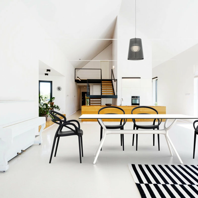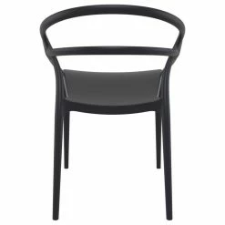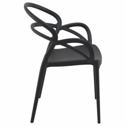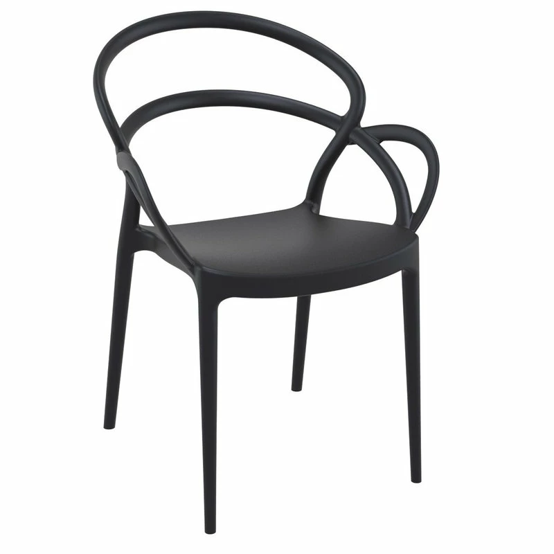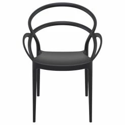 Mila indoor outdoor dining arm chair. Made from commercial grade resin with gas injection molded legs. Easy cleaning. Perfect for heavy use indoor outdoor areas. Round modern design.