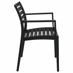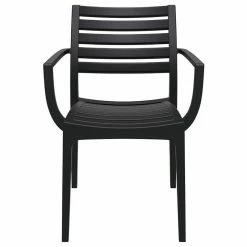 Artemis resin outdoor dining armchair. Comfortable seat and back. Super sturdy commercial strength. Made from commercial grade resin with gas injection molded legs. 100% recyclable polypropylene construction. No metal parts. UV resistant. Easy cleaning. Maintenance Free.Features
