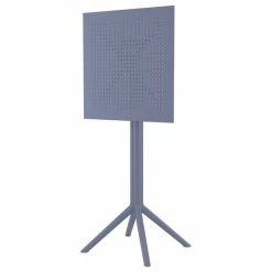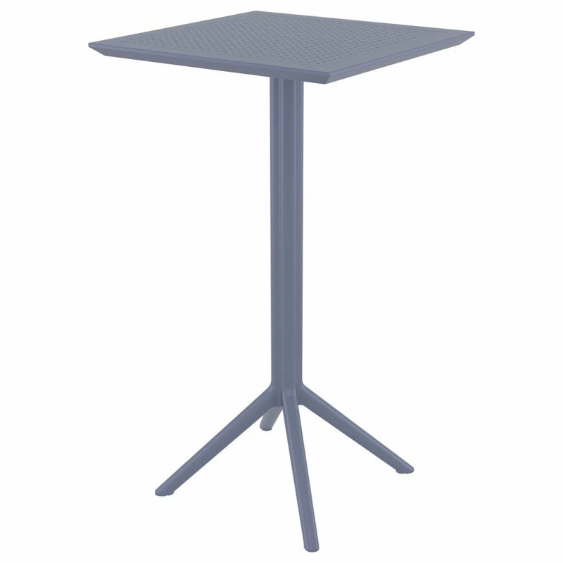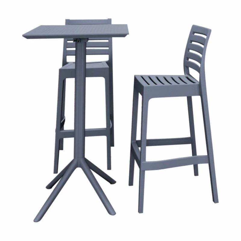 Bar height set with a 24 inch bar table and two bar stools. Folding top table is made with marine grade polypropylene with the latest generation of air moulding thermoplastic legs. Barstools are made of durable weather resistant polypropylene reinforced with glass fiber. No metal parts to rust, no moving parts to break. Made for commercial durability. Barstools are stackable. Perfect for heavy use areas such as hotels and restaurants. UV Treated. Hose down for easy cleaning. Withstands outdoor temperatures in summer and winter.