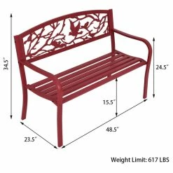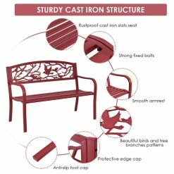 Our red cast iron garden bench will be a great additional to your garden or other outdoor living space for its bright color and modern design. It is a great place to sit and rest on while enjoying the outdoors. Made of steel slats , this bench is sturdy yet comfortable enough to relax on in the sun and durable for long life span. The seat is composed of 6 steel slats to provide support. This bench is a perfect gift to those who want to relax in the garden! Do not hesitate to buy one!