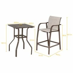 Products Dimension-Each Barstool Dimensions: 21.65″W x 25.59″D x 43.7″H. Seat Height: 27.5 inches. Armrest Height: 35 inches. Seat Size: 18.5″D x 18.3″W. Table Size: 25.59″L x 25.59″W x 36.61″H inches. Umbrella Hole Diameter:2 inches.