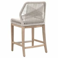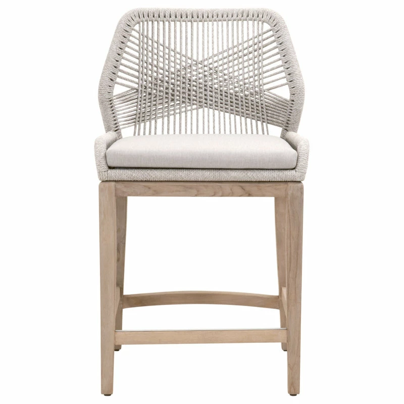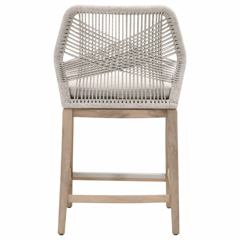 Loom Outdoor Counter Stool Taupe & White Flat Rope, Pumice, Gray Teak This woven outdoor counter stool will add a touch of coastal style to your backyard or patio. Constructed with an aluminum frame and solid Gray Teak legs, this stool is not only sturdy, but durable for outdoor use. A Taupe and White colored rope is tightly woven to create a unique loom design, while the Gray Teak legs have a beautiful wood grain finish. Paired with a removable Pumice all-weather seat cushion, the stool provides comfort with style and will be the perfect addition to any indoor or outdoor space. Woven Collection’s Fabric finishes made with natural materials feature unavoidable dye lot variation. Loom Outdoor Counter Stool Taupe & White Flat Rope, Pumice, Gray Teak Features: