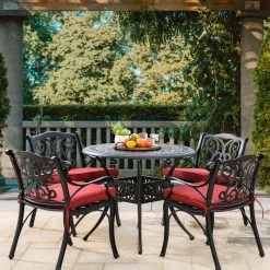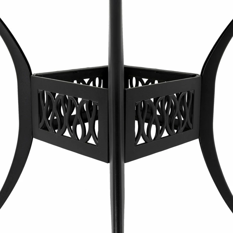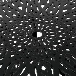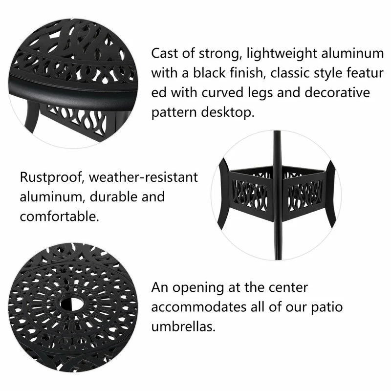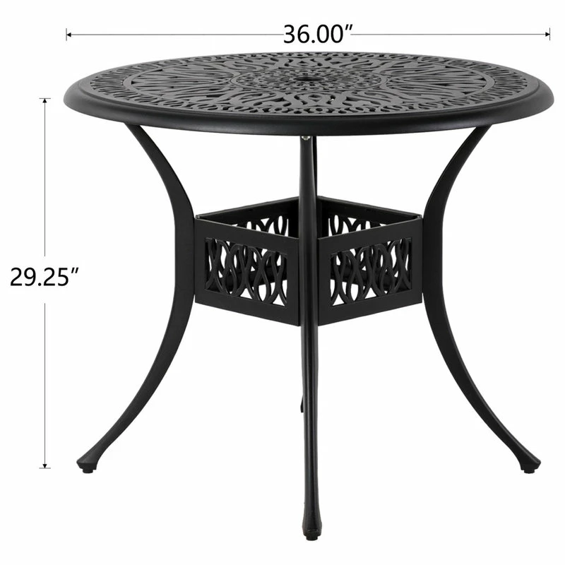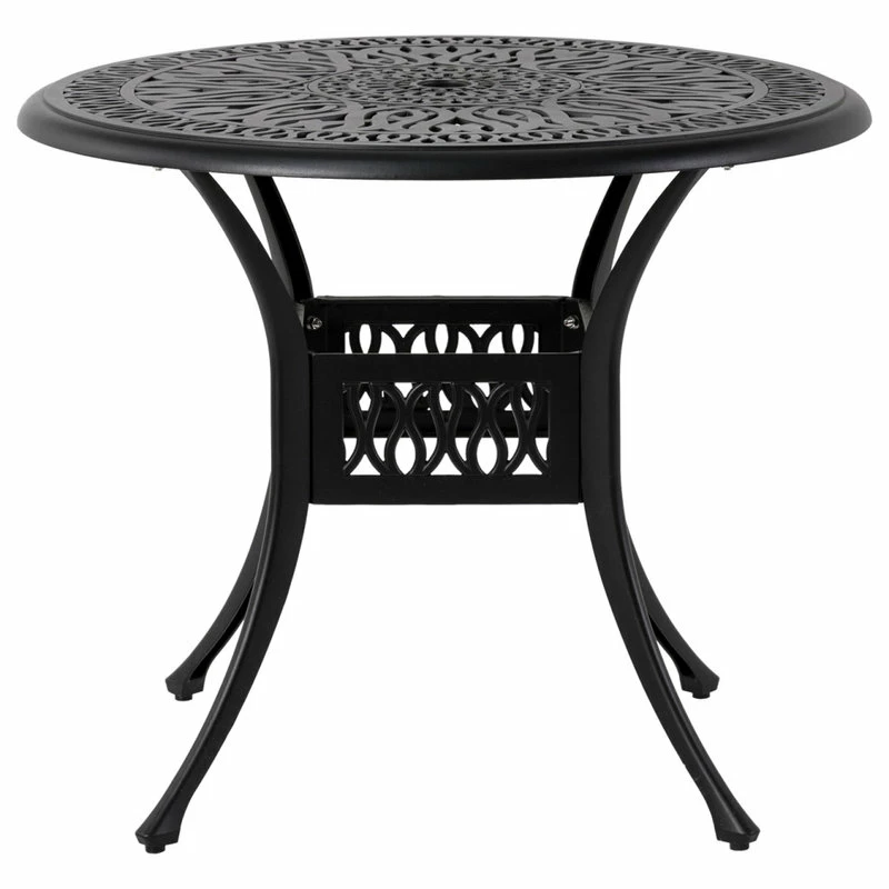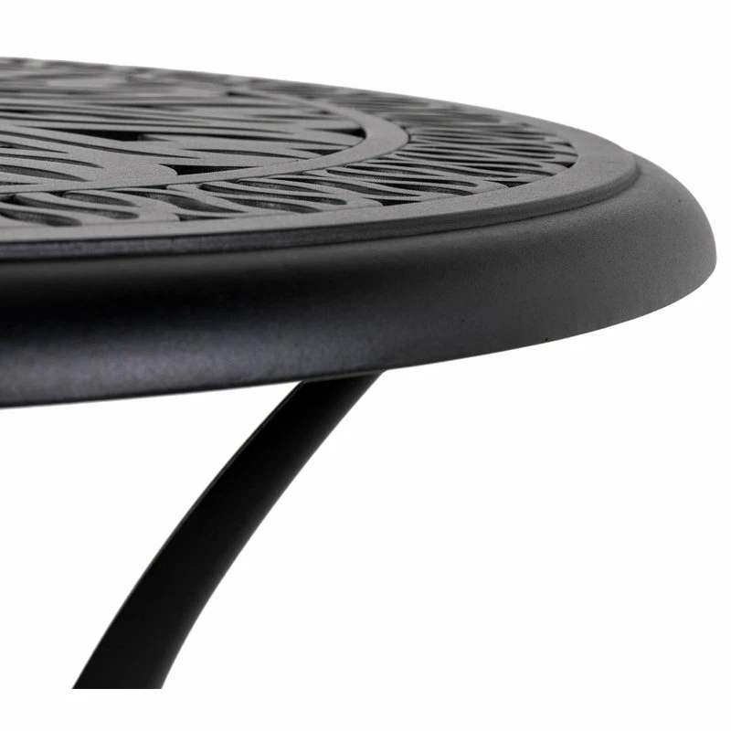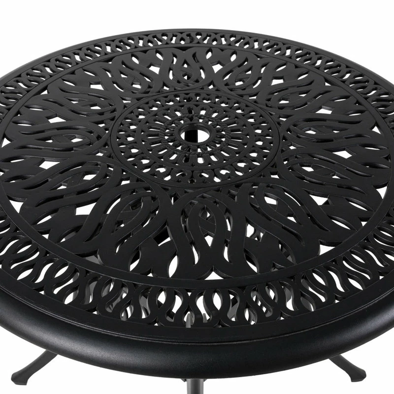 The dining table is suitable for any cast aluminium patio furniture in your garden, patio, or courtyard. Crafted from cast aluminum and a powder-coated black finish that wards off wear from weather and UV without any maintenance. Round desktop with dense weave motif that highlights its elegant hand-crafted details.