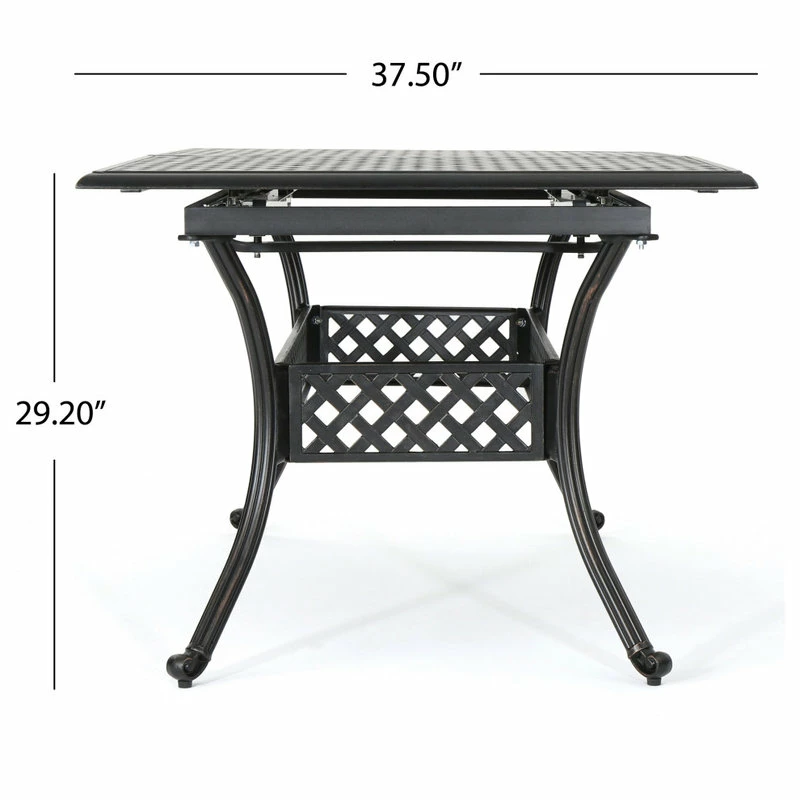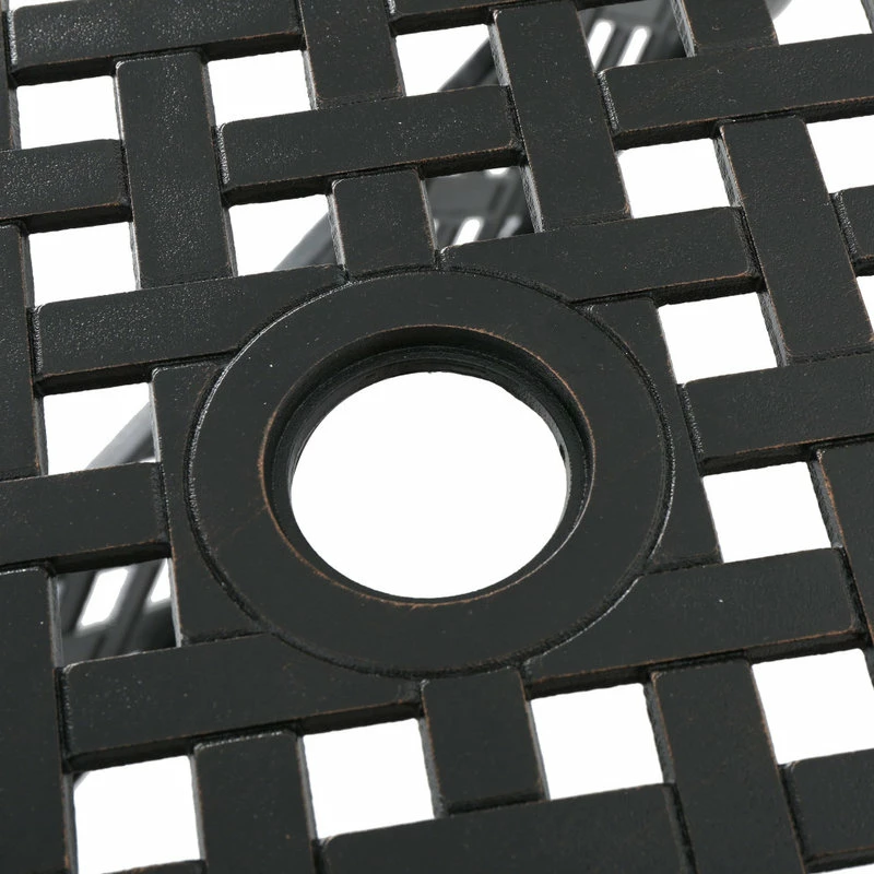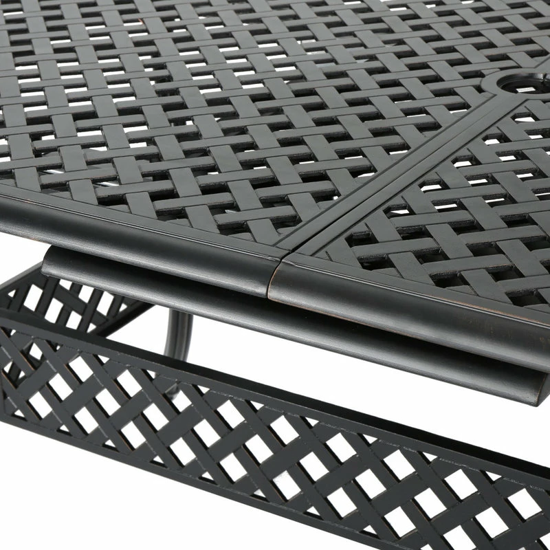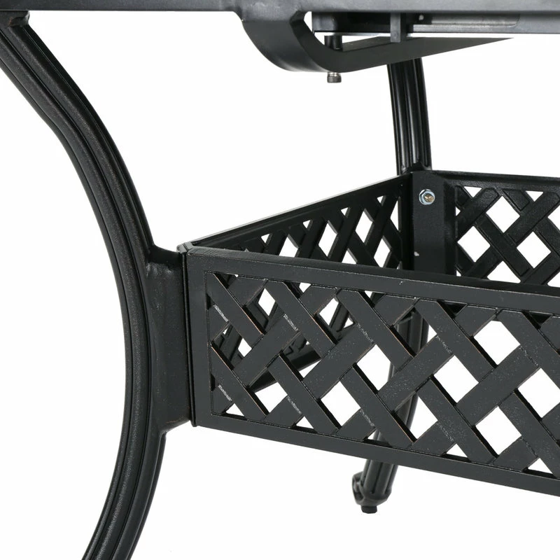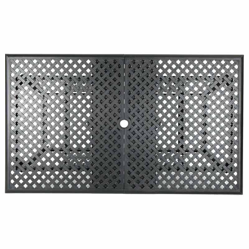 Let this beautiful outdoor dining table inspire a whole new era of outdoor mealtime memories! This carefully-crafted table is made of durable cast aluminum that’s sure to brave the elements. A classic lattice design, an umbrella hole, and curved, concave legs with scrolled feet complete the traditional look. Replace an old outdoor table with this sophisticated design or use it to start a new patio dining space. Turn wasted outdoor space into a stylish dining area with this table as the anchor.