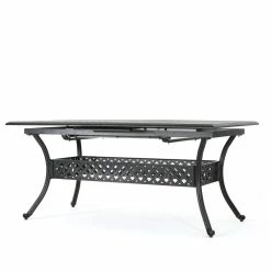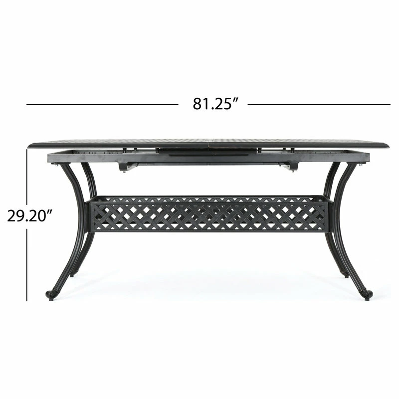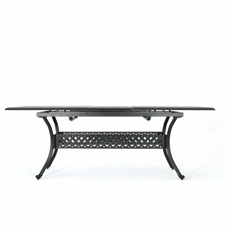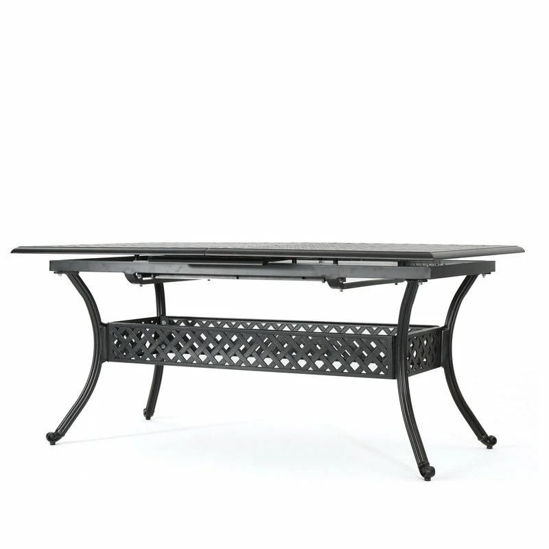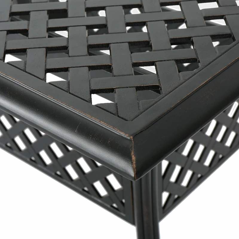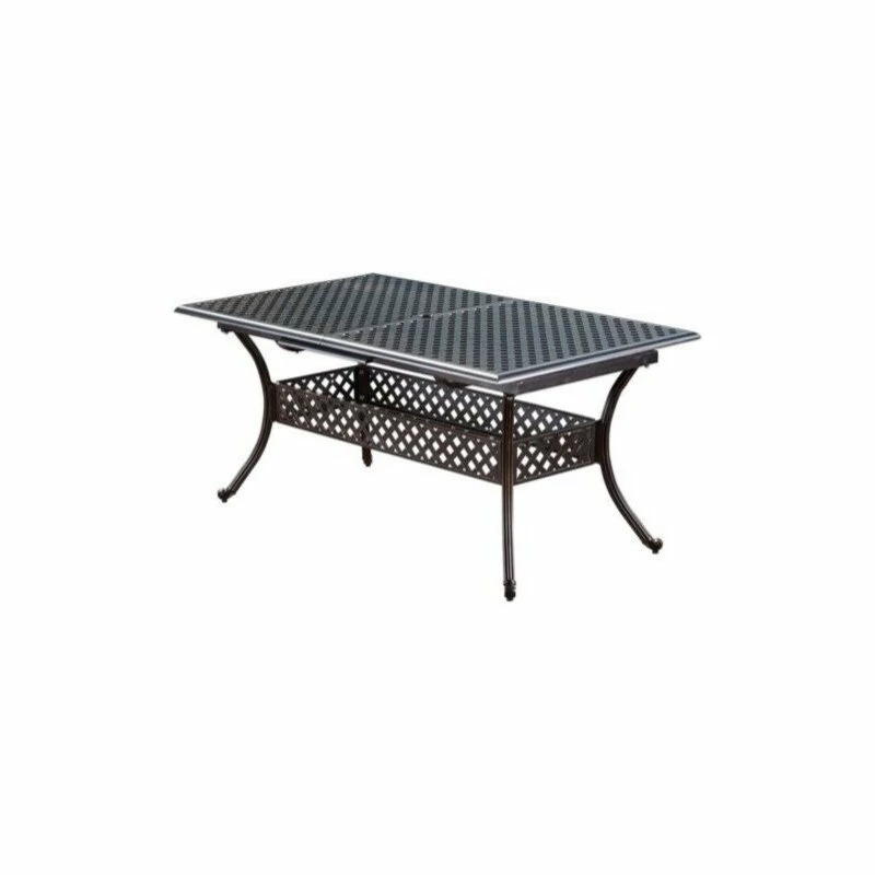 Let this beautiful outdoor dining table inspire a whole new era of outdoor mealtime memories! This carefully-crafted table is made of durable cast aluminum that’s sure to brave the elements. A classic lattice design, an umbrella hole, and curved, concave legs with scrolled feet complete the traditional look. Replace an old outdoor table with this sophisticated design or use it to start a new patio dining space. Turn wasted outdoor space into a stylish dining area with this table as the anchor.