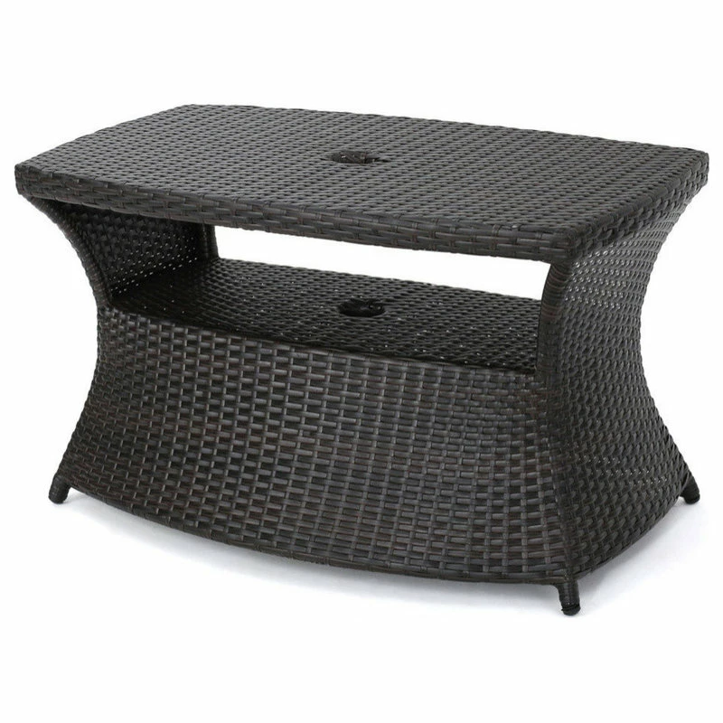 This stylish outdoor table is a great addition for any patio. Featuring a space to add an umbrella as well as enough top space and shelf space for this table to double as both coffee table and serving table for plates and small dishes while hosting. This table does it all and looks good doing it. You can’t go wrong and your patio will look that much better with the addition of this side table.