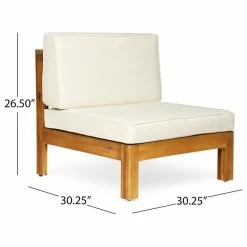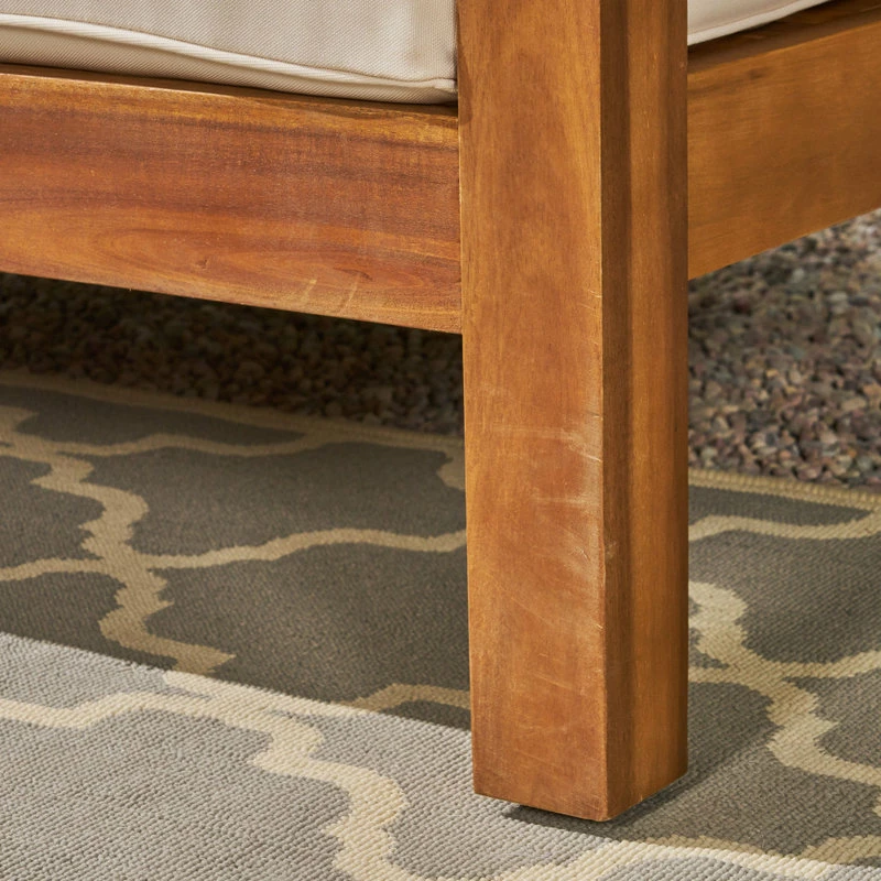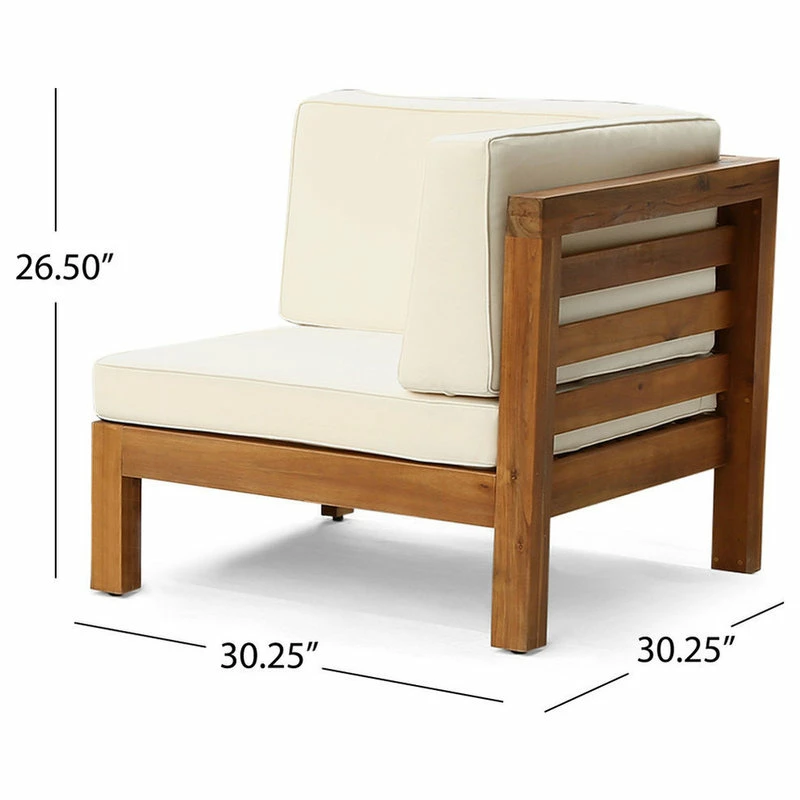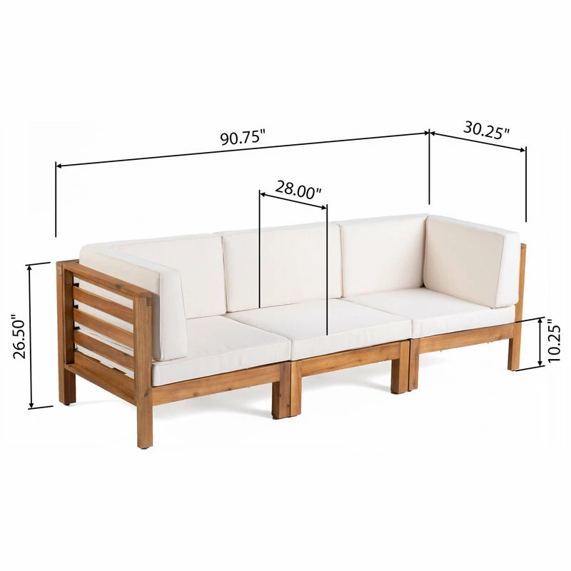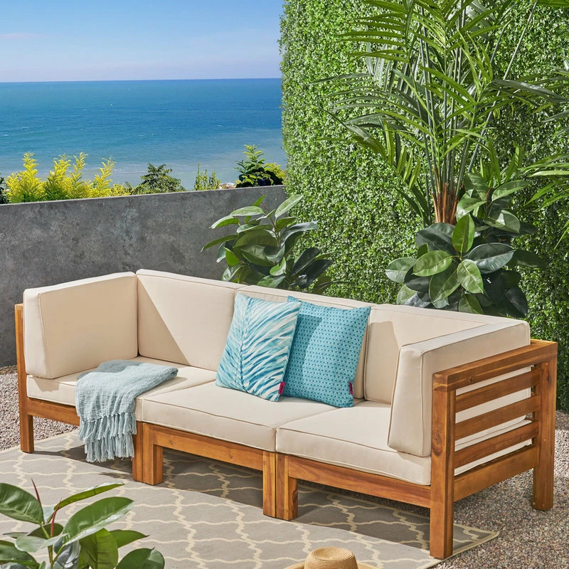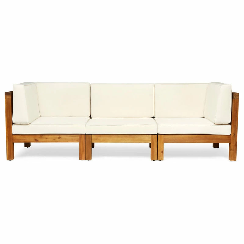 In search of an outdoor furniture set that delivers big on style without dominating the entire patio? Perfect for small yards and urban apartment living, this sofa sectional is all you’ll ever need for those intimate at-home gatherings for only your closest friends; this set comes with two twin sectional end pieces and an armless component, and can be configured in a row all together or separated to complement the rest of your current outdoor collection. Features solid acacia wood frames and water-resistant outdoor cushions; stylish, modern, true to classic mid-century design.