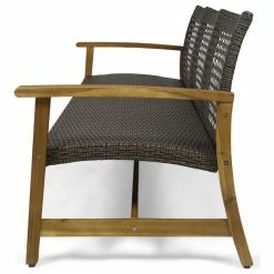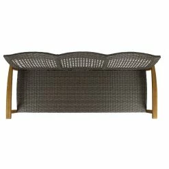 ACACIA WOOD WITH COMPLEMENTING FINISH: This frame consists of an acacia hardwood that accents the wicker seat. This material is washed with a complementing finish and maintains a sturdy foundation for the sofa that can withstand most weather conditions.