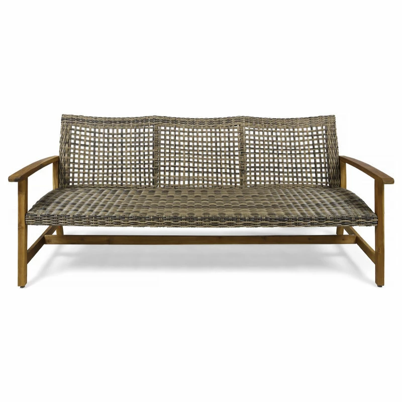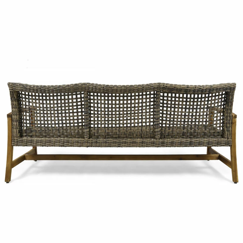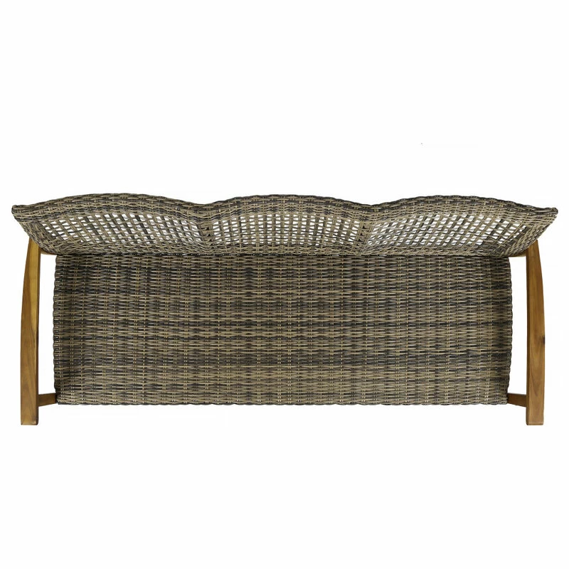 ACACIA WOOD WITH COMPLEMENTING FINISH: This frame consists of an acacia hardwood that accents the wicker seat. This material is washed with a complementing finish and maintains a sturdy foundation for the sofa that can withstand most weather conditions.