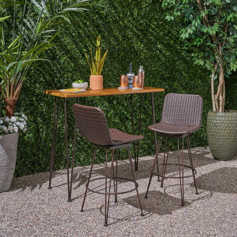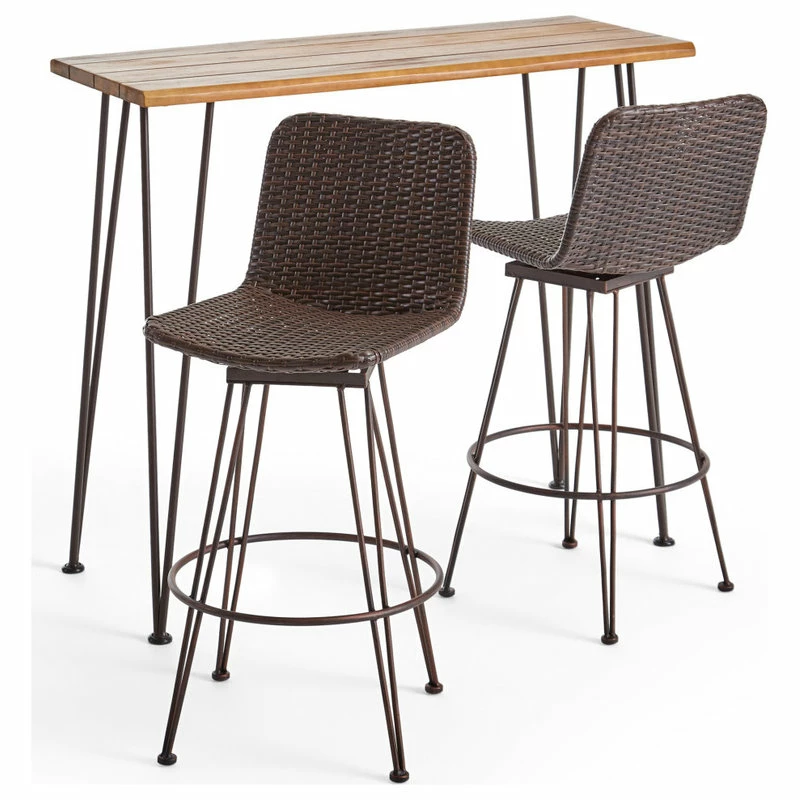 An intimate conversation in a relaxing space has the power to turn your entire week around. Take sweet relief in this modern industrial retreat and share a meal or a beverage with one of your favorite friends on a refreshing summer morning. This sleek bar set of table and chairs will not only give you a brand new place to unwind with a chilled drink but will also add a trendy edge to previously lackluster outdoor seating or dining area for all to enjoy.