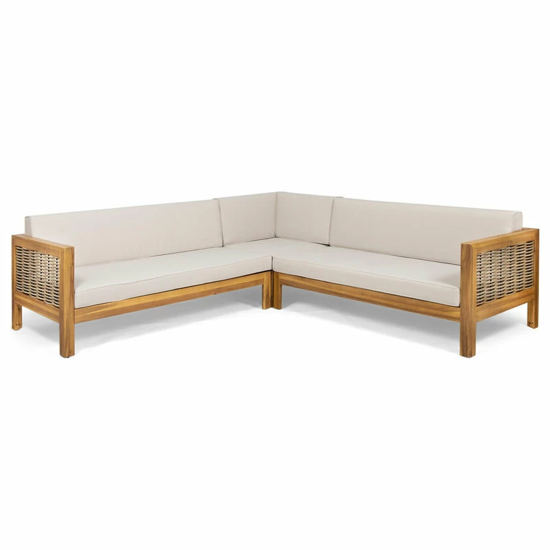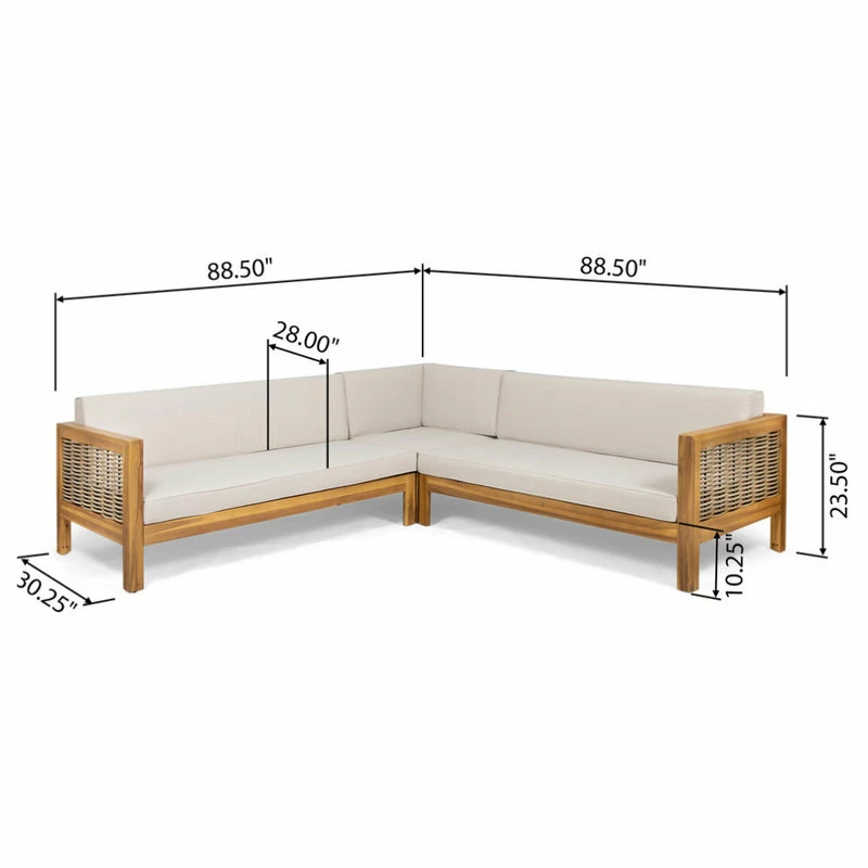 Stretch out under the summer sun or host an intimate conversation with your friends with the help of our delightful sectional sofa set. This set brings both incredible comfort with its water-resistant cushions and immaculate style with an extraordinary open slat design in its seating. Featuring a gorgeous mix of woven wicker and acacia wood, this set brings the best of the best to your backyard or patio space, making this your go-to for outdoor parties and casual moments of relaxation.