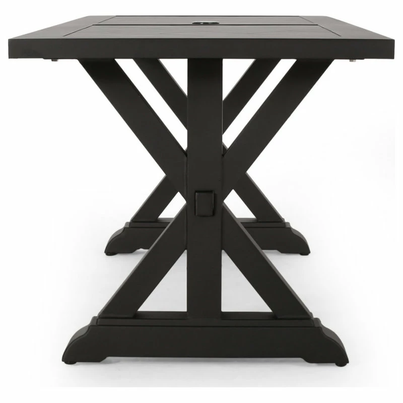 Brush up your dining area with both style and comfort that all will enjoy. Made from aluminum, our dining table offers reassuring durability and a polished look to your outdoor space, making this the perfect centerpiece for a wide variety of chairs. The legs are finished with a beautiful X-shape, bringing a rustic influence to this modern design that gives any backyard or patio a sleek upgrade. Finished with a convenient umbrella holder, this table provides you with ample space to enjoy endless summer days.