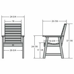 This product is assembled with 304-grade stainless steel hardware and comes with the assurance of a manufacturer’s 12-year residential limited warranty. The chairs have been load-tested, per ASTM 1561-03 (2008) standard for outdoor plastic furniture and have a 500-pound weight capacity. Some assembly is required (see assembly guide) and assembled dimensions are 24.75L x 37.9″H x 25.9″D (25lbs).