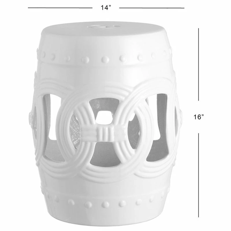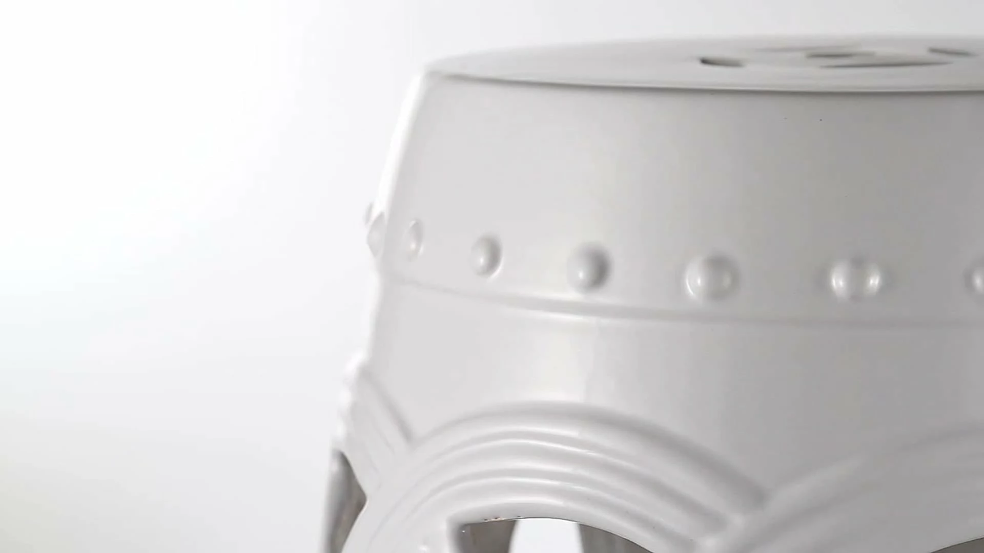 Our drum-shaped ceramic Chinese garden stool brings good fortune with a central band of lucky coin symbols. Chinoiserie garden seats are loved by traditional design fans, but our solid white glaze gives this stool a modern touch. Use it indoors or outside as a cocktail table, garden seat, or plant stand.