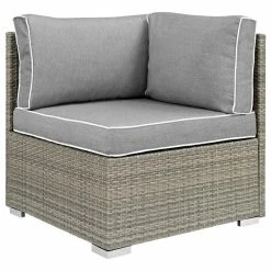 Enjoy the outdoors while benefiting from style and comfort. Repose offers a detailed tan and gray synthetic rattan weave with UV protection for eye-catching appeal and durability, plush 4 thick all-weather polyester cushions with contrasting color French piping, non-marking foot pads, and a sturdy powder-coated aluminum frame that supports up to 331 pounds. Subtle style defines the Repose outdoor sectional collection making it a natural choice for enhancing your patio, backyard, or poolside gatherings. This installment of the series is a corner piece.