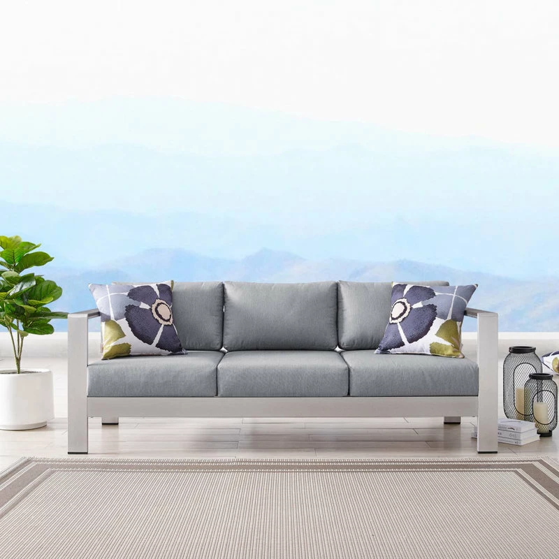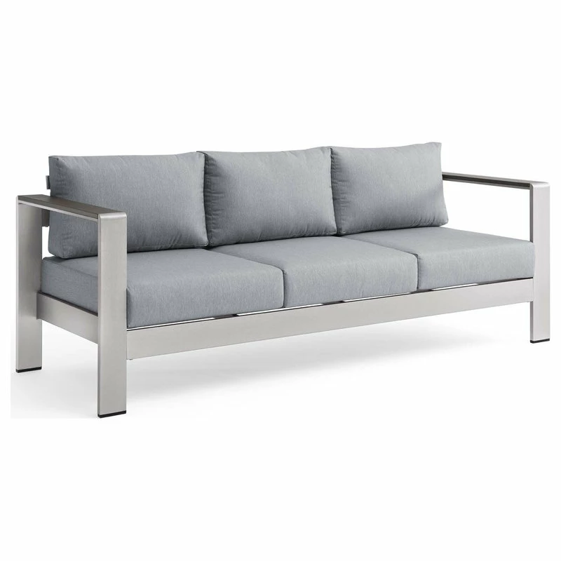 Enjoy your patio or backyard leisure time with the strong and durable Shore Outdoor Patio Aluminum Sofa. Made with an anodized brushed aluminum frame and non-marking black plastic foot caps, Shore Patio Sofa comes outfitted with removable, resilient fabric canvas cushions that are easy-to-clean and tested to last through all weather conditions. The Shore Outdoor 3-Seater Sofa complements your casual gatherings with a look and functionality you can rely on. Sofa Weight Capacity: 900 lbs.