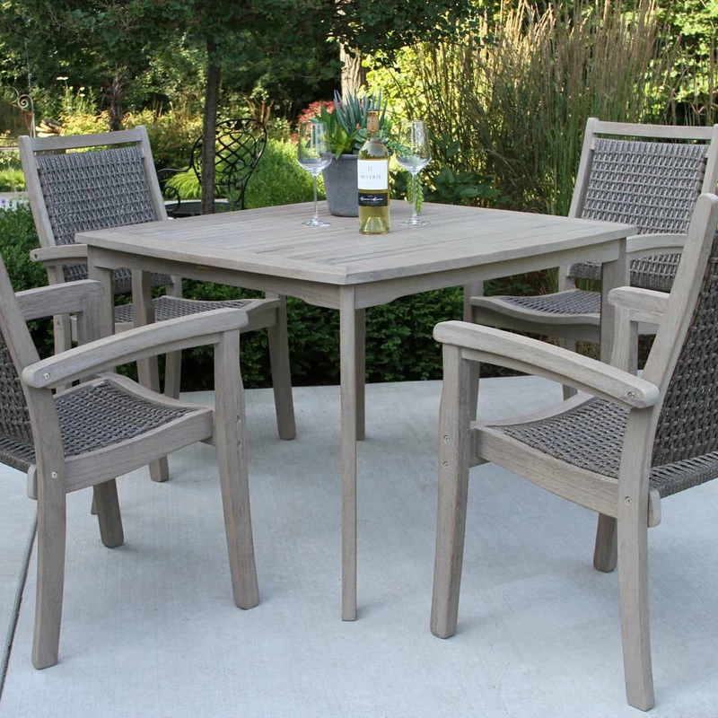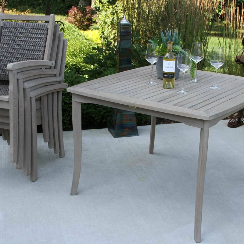 Our Gray Wash Collection requires less maintenance than other natural eucalyptus, teak, or stained hardwoods. Yet, oiling can help prolong and rejuvenate the finish. Depending on the amount of exposure to the elements, the finish may fleck and weather, allowing the eucalyptus to then naturally patina when left outside. Always cover or store away your furniture during harsh weather and winter.