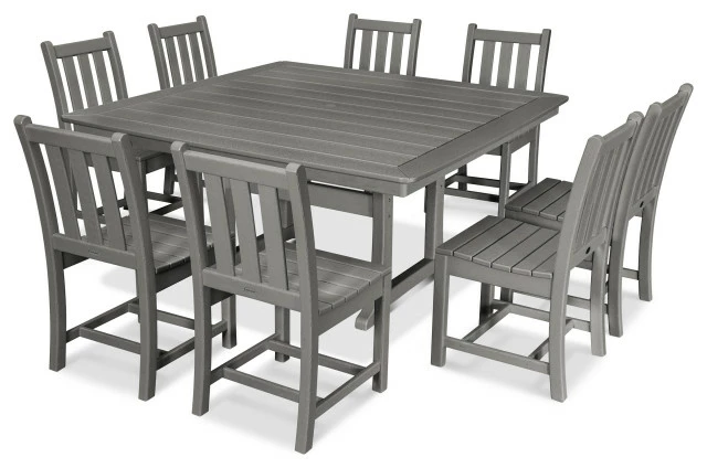 Create the perfect outdoor dining space on your patio or deck with the Traditional Garden 9-Piece Nautical Trestle Dining Set. This all-weather set seats up to eight and allows everyone at the table to be a part of the conversation. The Traditional Garden Dining Side Chairs are contoured for comfort while the Farmhouse 59″ Dining Table provides plenty of tabletop and legroom underneath.
