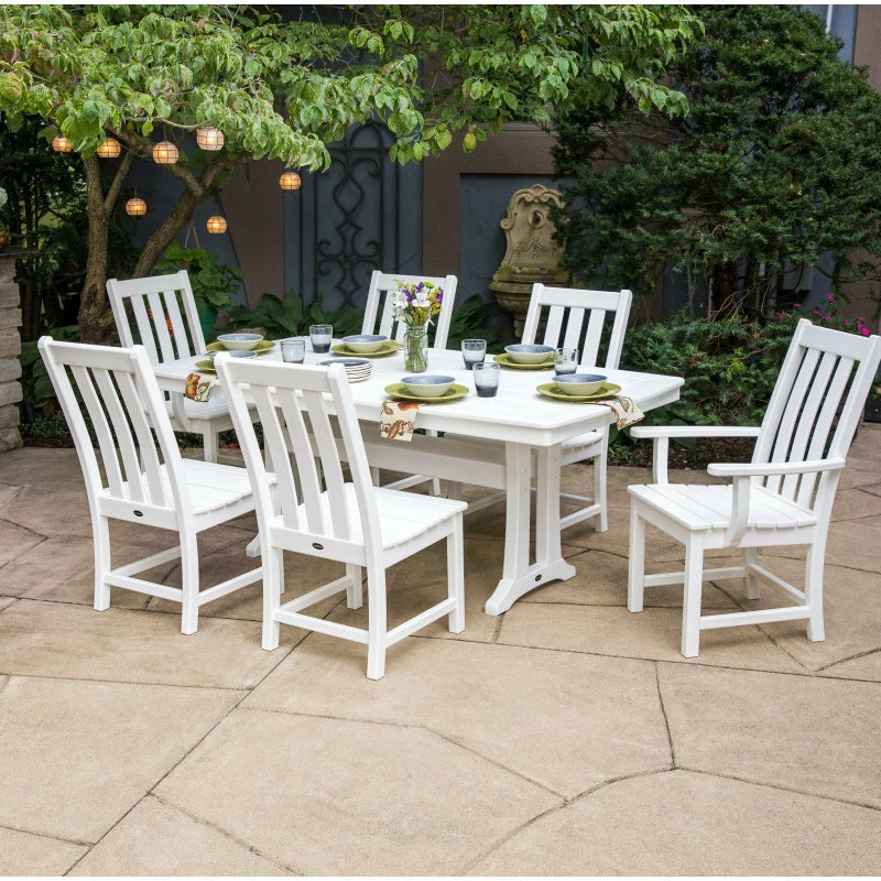 The Vineyard 7-Piece Nautical Trestle Dining Set seats up to six guests for a comfortable outdoor dining experience. The Vineyard Dining Chairs feature a comfortably arched back at just the right angle to conveniently dine and carry on conversation long after dessert.