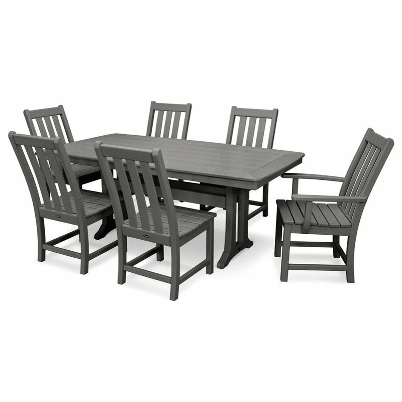 - Includes (4) Vineyard Dining Side Chairs, (2) Vineyard Dining Arm Chairs and (1) Nautical Trestle 38″ x 73″ Dining Table
