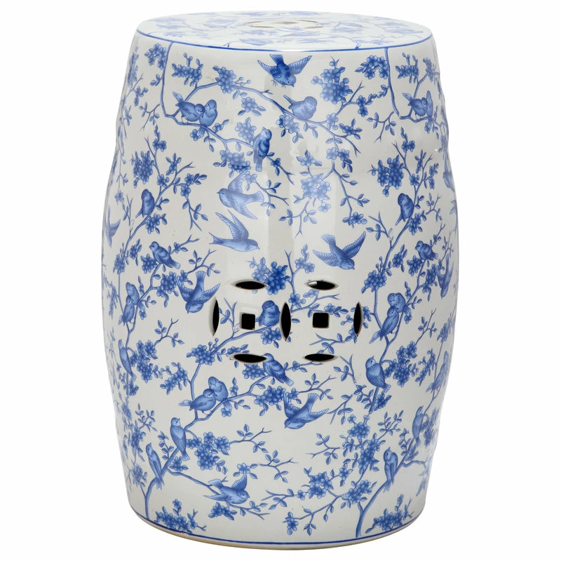 Inspired by classic porcelain from the Yuan dynasty, the delicate patterning of our glazed ceramic Blue Birds Garden Stool complements both traditional and eclectic settings. Use this charming piece as a single accent or place several in a cluster for decorative drama indoors or out.