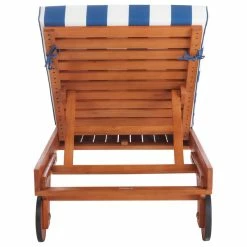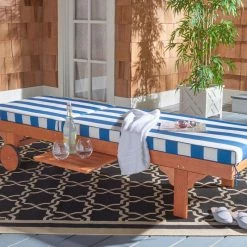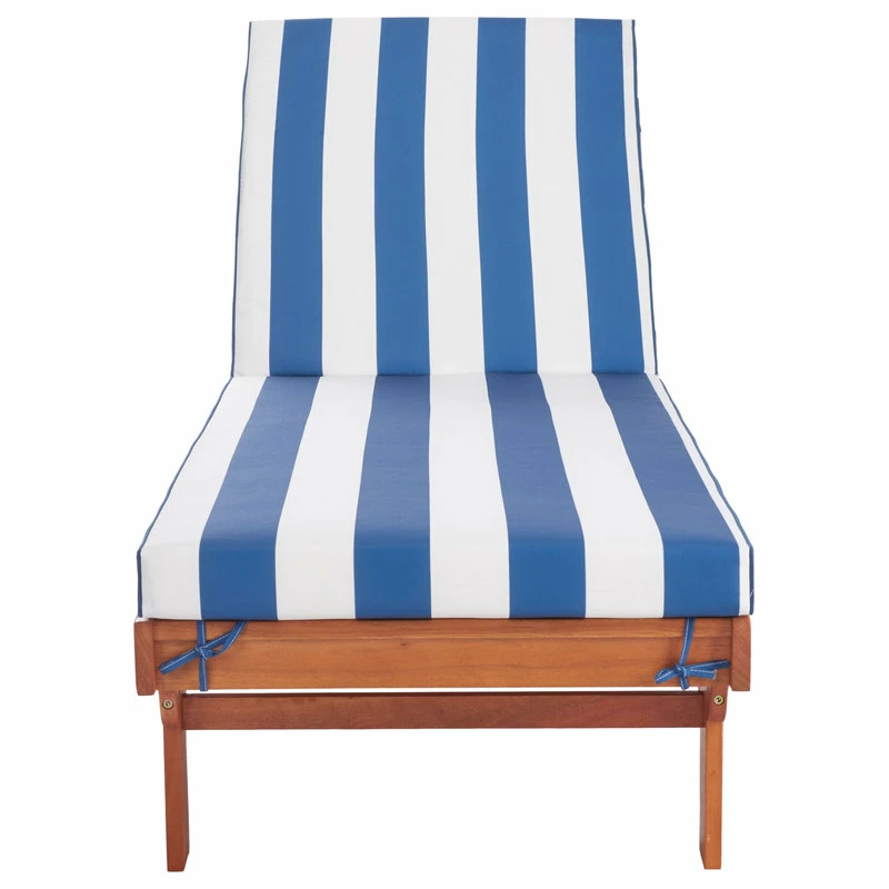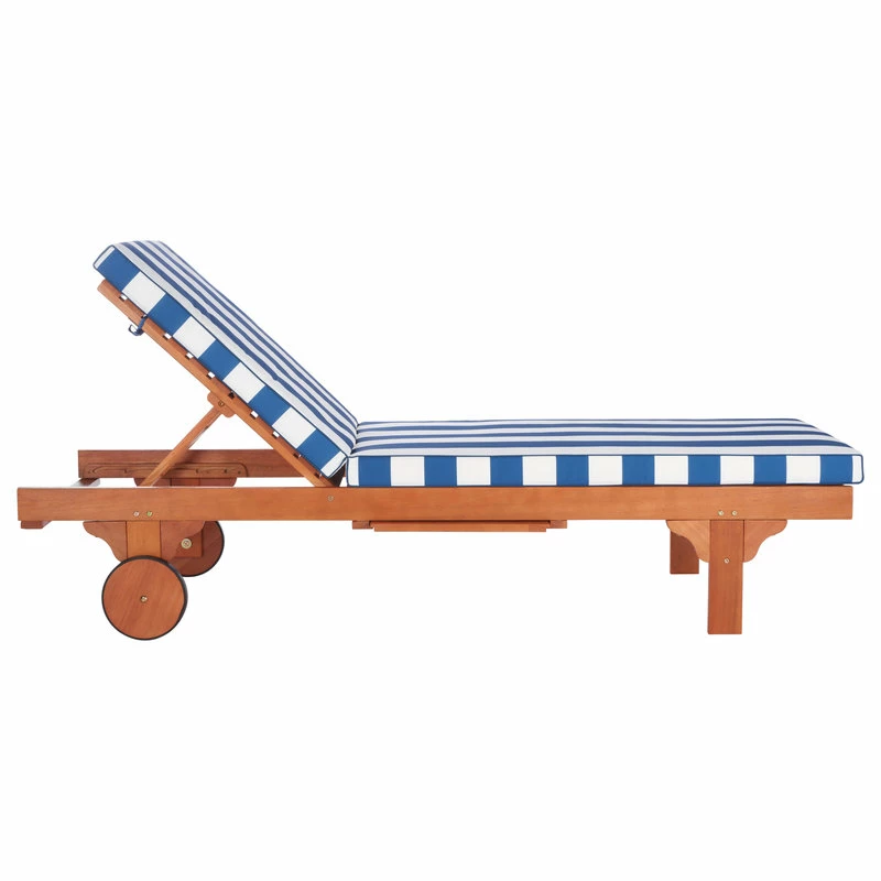 A fresh update of an English garden classic, the Newport Outdoor Lounge Chair recalls the manicured landscapes of Rhode Island seaside mansions. Newport is crafted with striped blue fabric and naturally finished eucalyptus wood with back wheels for easy mobility and a sliding table for drinks.