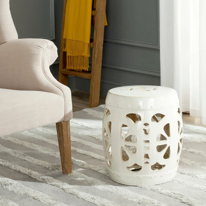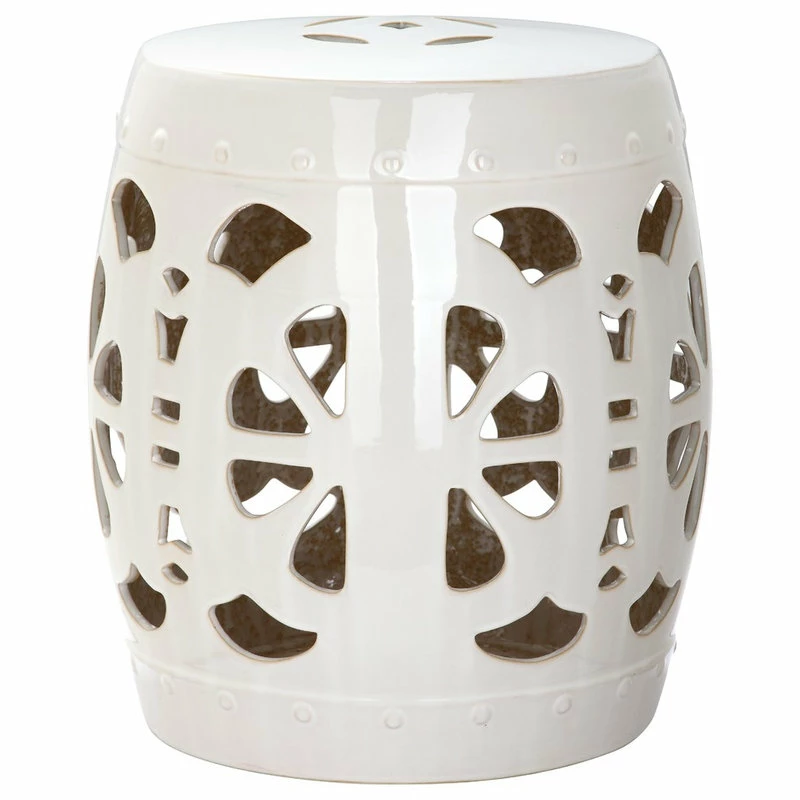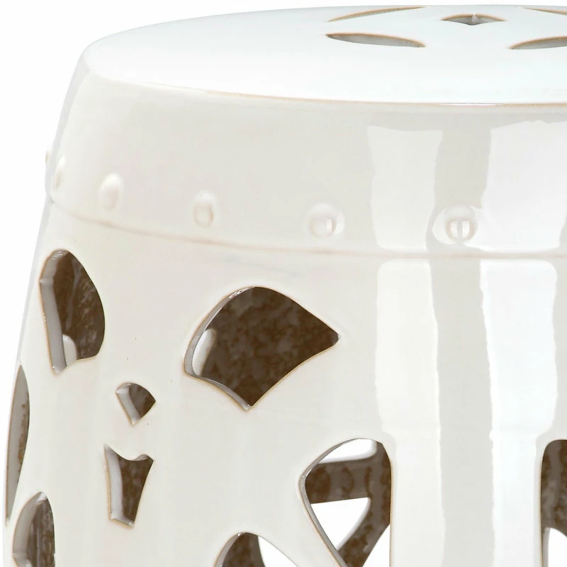 An over-scale pierced cutout creates a bold contemporary statement in the glazed ceramic Stencil Blossom Garden Stool. Inspired by the gates guarding imperial Chinese royalty, this beautiful stool gives any space a designer’s finishing touch.